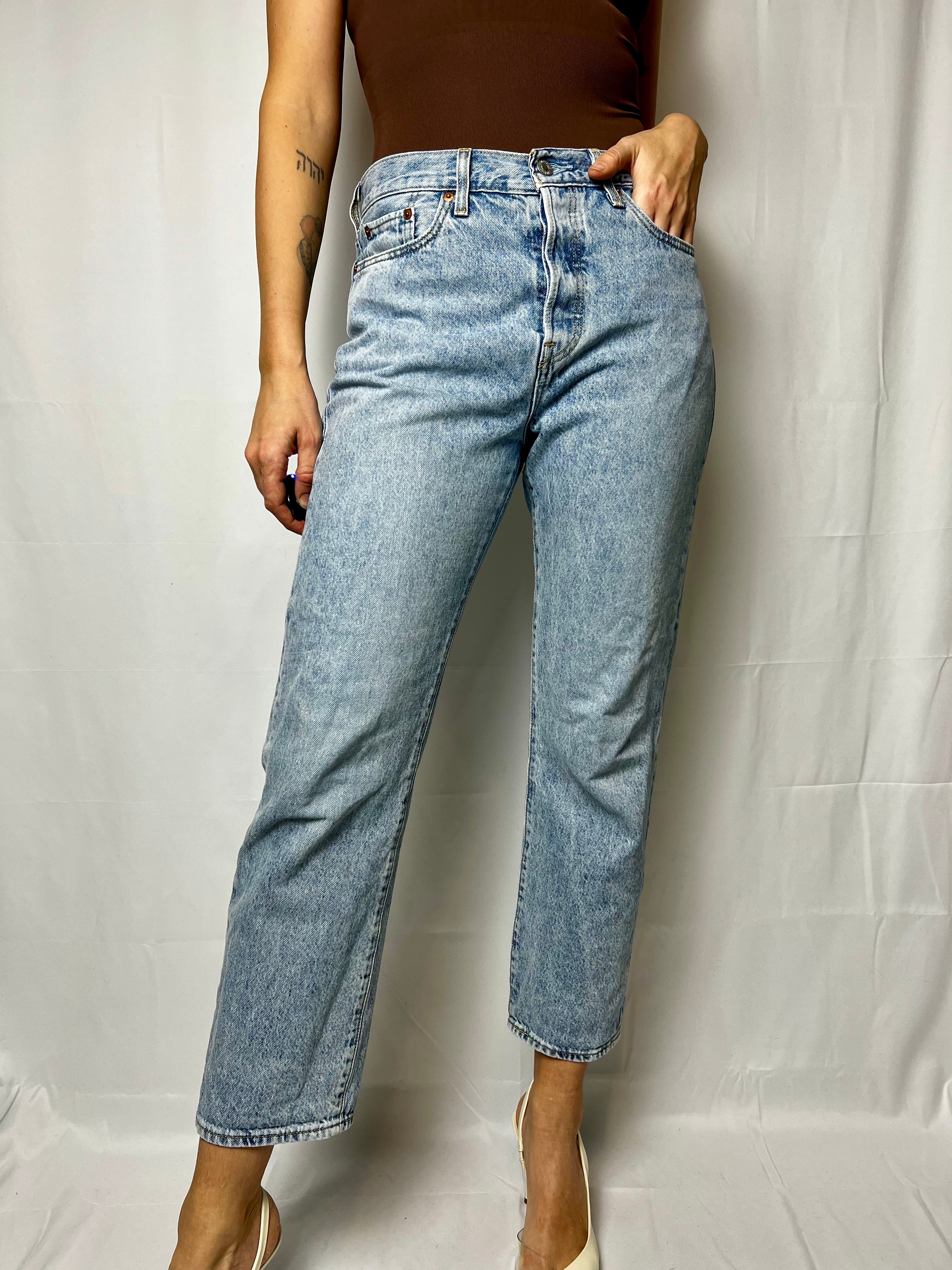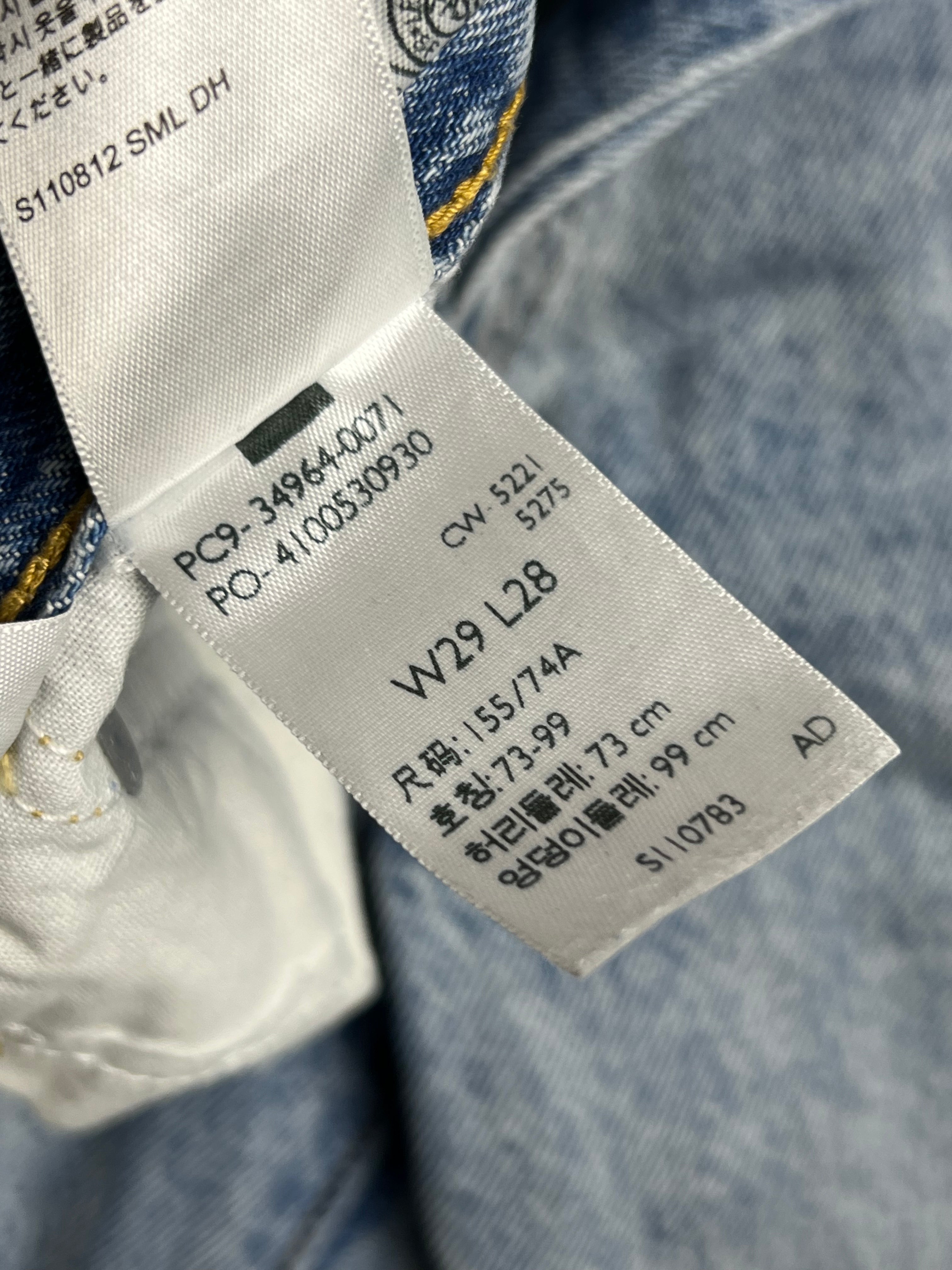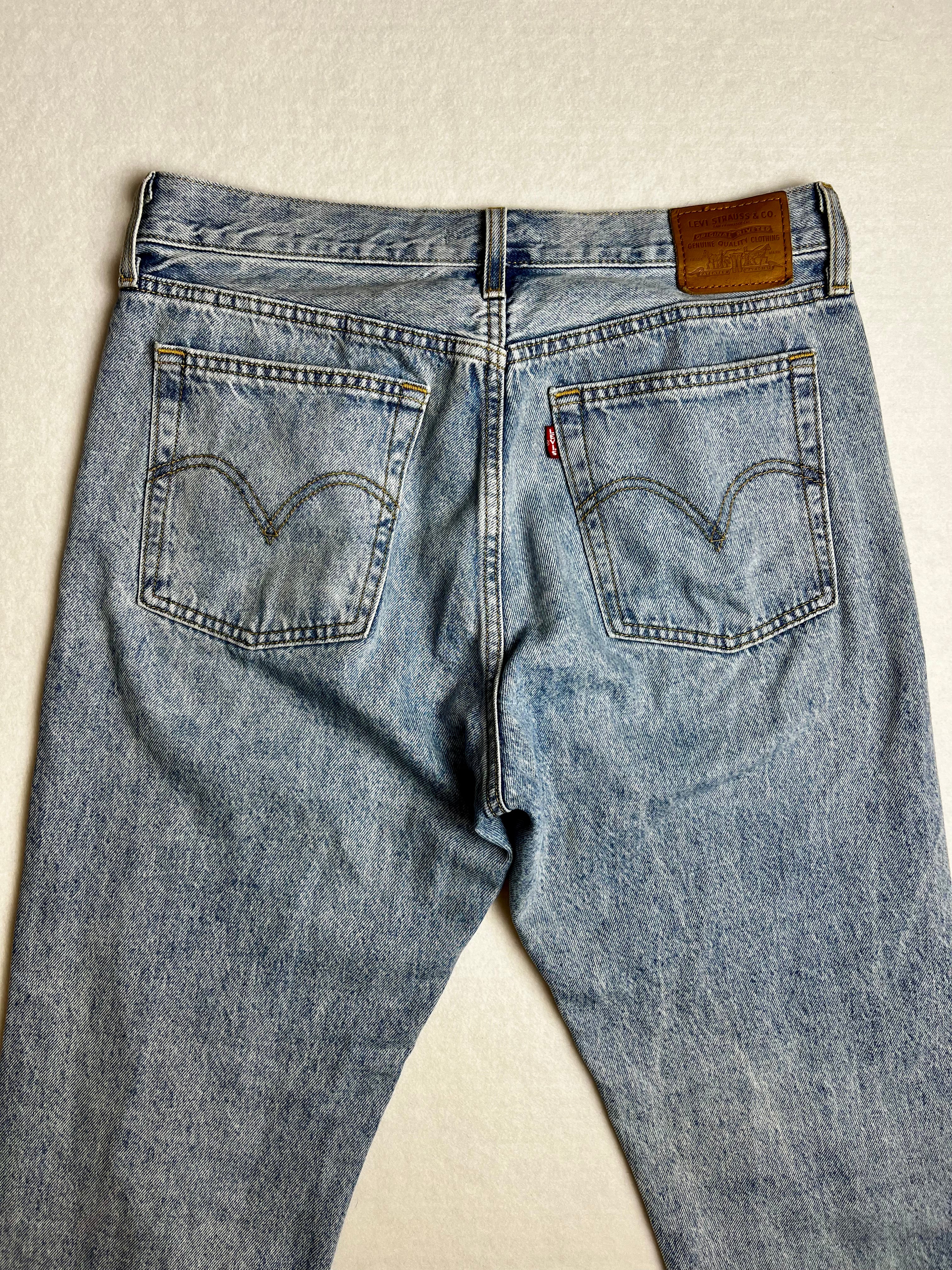 Inspired by classic vintage Levi's styles, they feature a flattering high-rise waist and butt-lifting effect, giving you a sculpted silhouette. The straight-leg cut flows effortlessly from hip to ankle, offering a relaxed yet tailored vibe in a timeless light-wash denim with authentic fading, complete with the signature button fly and leather patch at the waistband.
